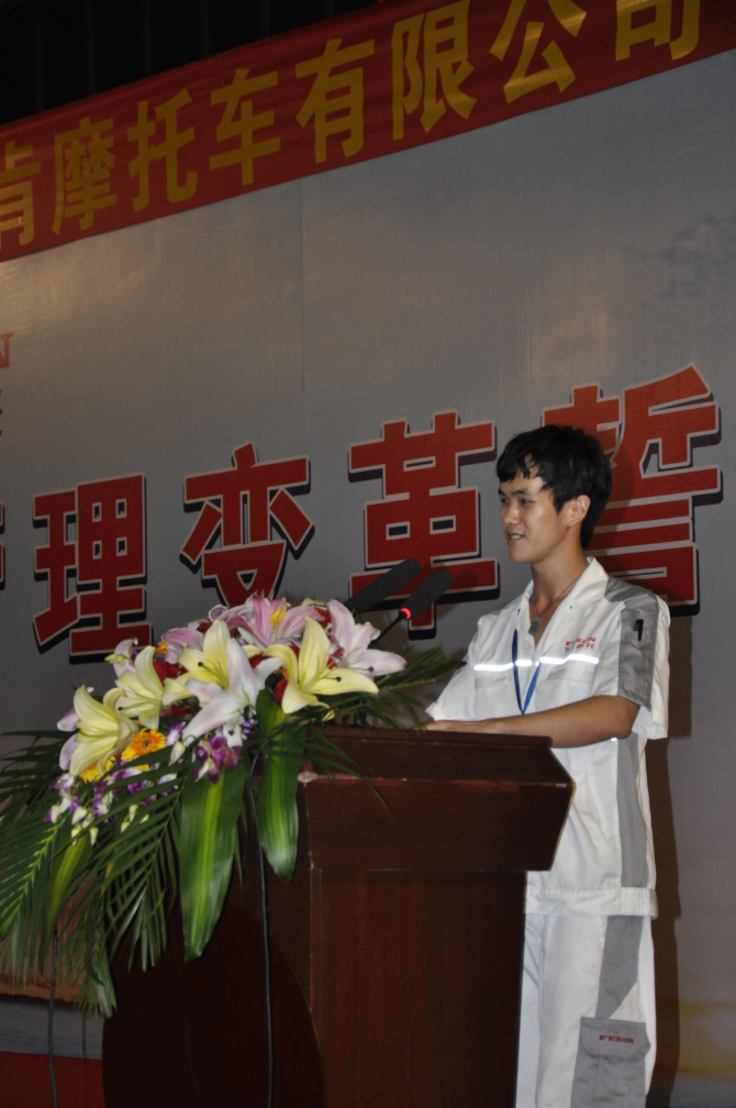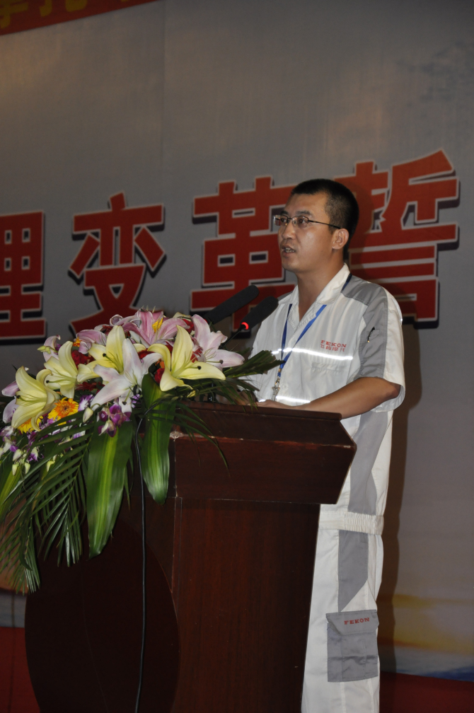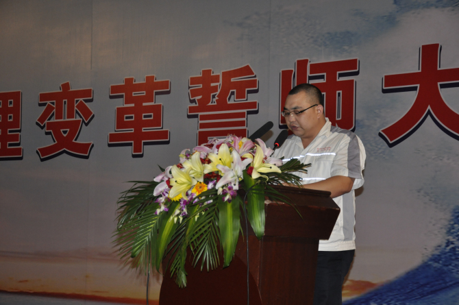 “恰逢公司今年推行企业变革,变革工作是一项全员参与工程,其内部推进离不开公司领导、各部门主管和全体员工的参与和支持。为此我代表发动机厂承诺从我做起,做好表率和引导,从中不断学习、持续改进,提升发动机整体管理水平,使整体效率有所搞高,不断改善流程,完成各种绩效目标。当然,项目在推进中,肯定会遇到较多的困难和阻碍,但我相信,只要用我们的热情,敢于去变革、去改善,下定决心,一要问题都会迎刃而解!”