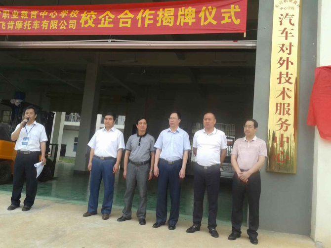 来宾市教育局谭强书记亲自主持接待了飞肯摩托董事长郑滨一行二人;来宾市教育局副局长钟宝昌主持了飞肯摩托与来宾职业教育中心学校战略校企合作对接洽谈会。来宾职校各层领导、各专业部主任、汽修专业师生代表200人,参加了本次签约仪式,签约仪式上,来宾教育局副局长钟宝昌先生就来宾职业教育中心学校办学情况、校企合作思路、希望达成的效果进行了比较详细的阐述;公司董事长郑滨先生就飞肯摩托过去、现在、未来以及飞肯对人才培养的方向和策略以及希望通过校企合作达到的效果进行了深入的阐述,他表示“来宾职校有高素质的学生资源以及良好的信誉,与来宾职校的合作将会极大推动企业的发展”;人力资源部负责人邓志彪先生就飞肯对人才培养的方针、校企合作的成功案例、校企合作具体操作办法、飞肯企业文化、校企合作的步骤等进行比较详细的介绍和阐述。后经自由讨论,就双方如何在科研、人才培养、企业文化建设等方面寻找结合点提出各个相关意见。