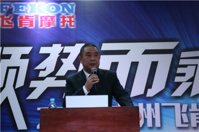 陈培安总经理首先做欢迎辞,成都利德摩托车销售有限公司自今年年初起开始经营飞肯品牌,在陈总的带领下,飞肯摩托在四川区域取得了长足的进步,自接手以来,到如今,飞肯品牌在四川的销量已经达到4000左右辆,这极大地增强了经销商的信心。
