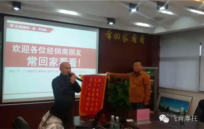 广西南宁杨总,南宁火灾的主人翁。他非常感谢郑总,感谢飞肯给他的帮助,特意送来了锦旗,还现场朗诵了自己的感谢信。“我做摩托车做了十几年,做过的摩托车品牌不下25家,为什么换品牌,关键在人。今天,我认定飞肯,也是因为人,因为飞肯人扛得起,靠得住,做得值。今年是飞肯的十周年,我一定全力以赴,和飞肯一起打好2015年的这场硬仗,也诚挚地邀请你们,萍乡的经销商朋友们,和我一起,和飞肯一起,赢战2015。飞肯摩托,真的值得信赖。”