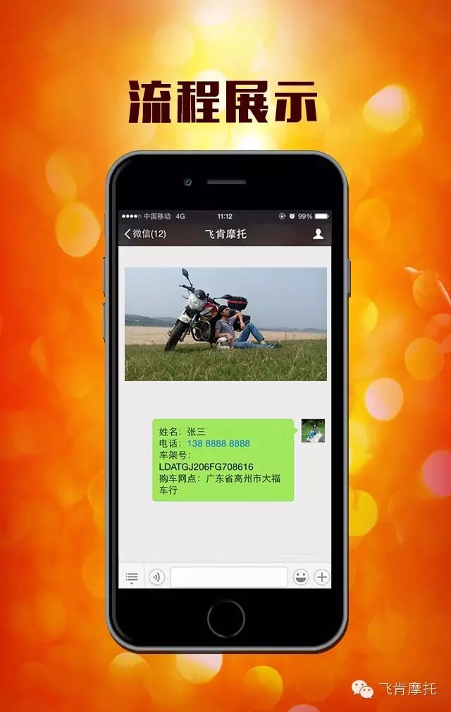 2、发送您与飞肯摩托的靓照至飞肯微信公众平台