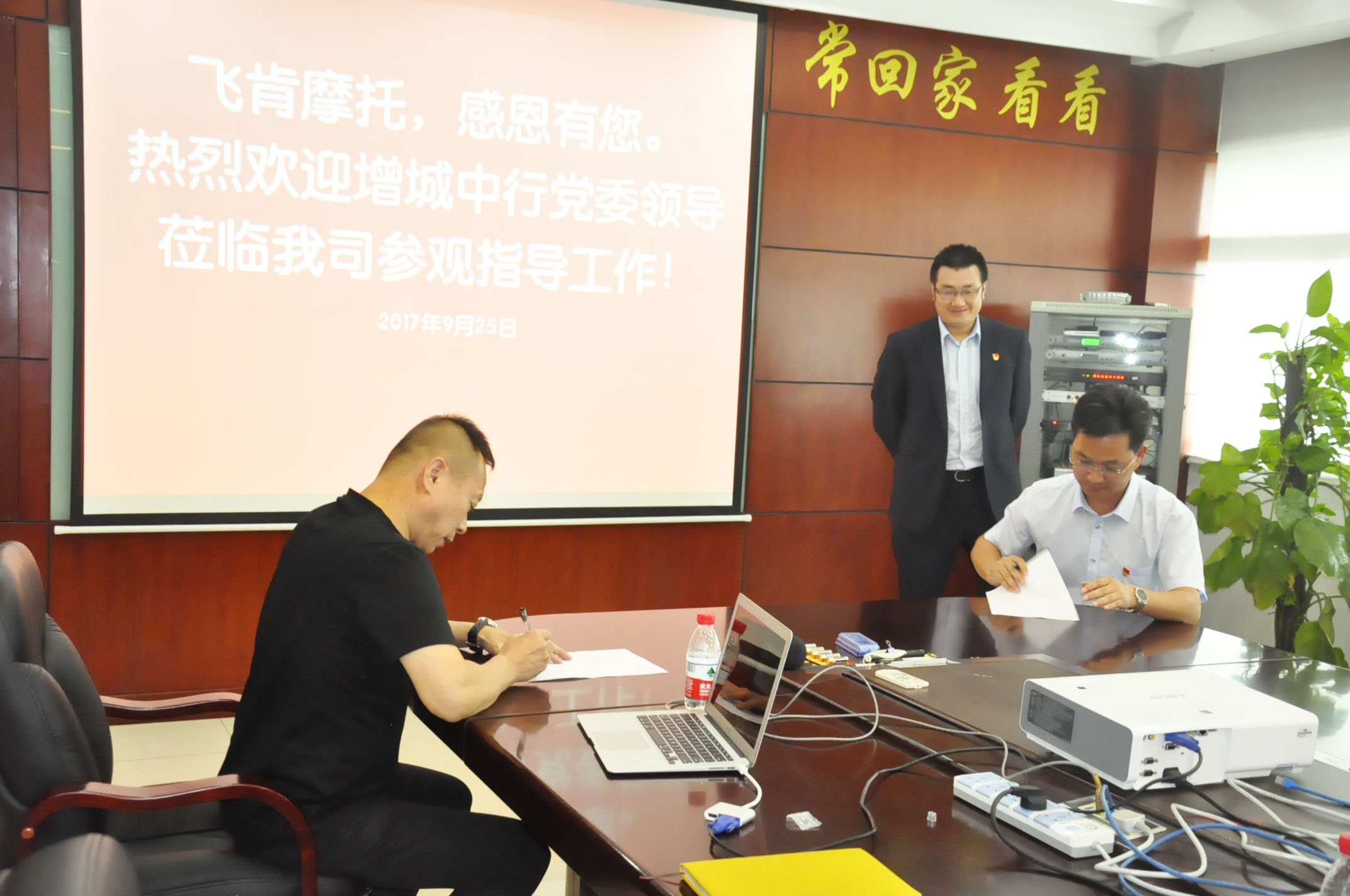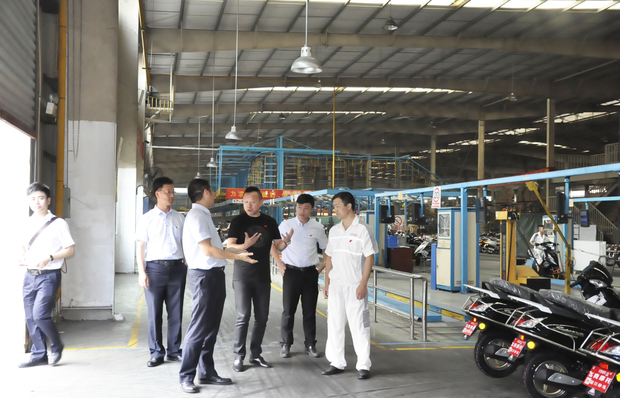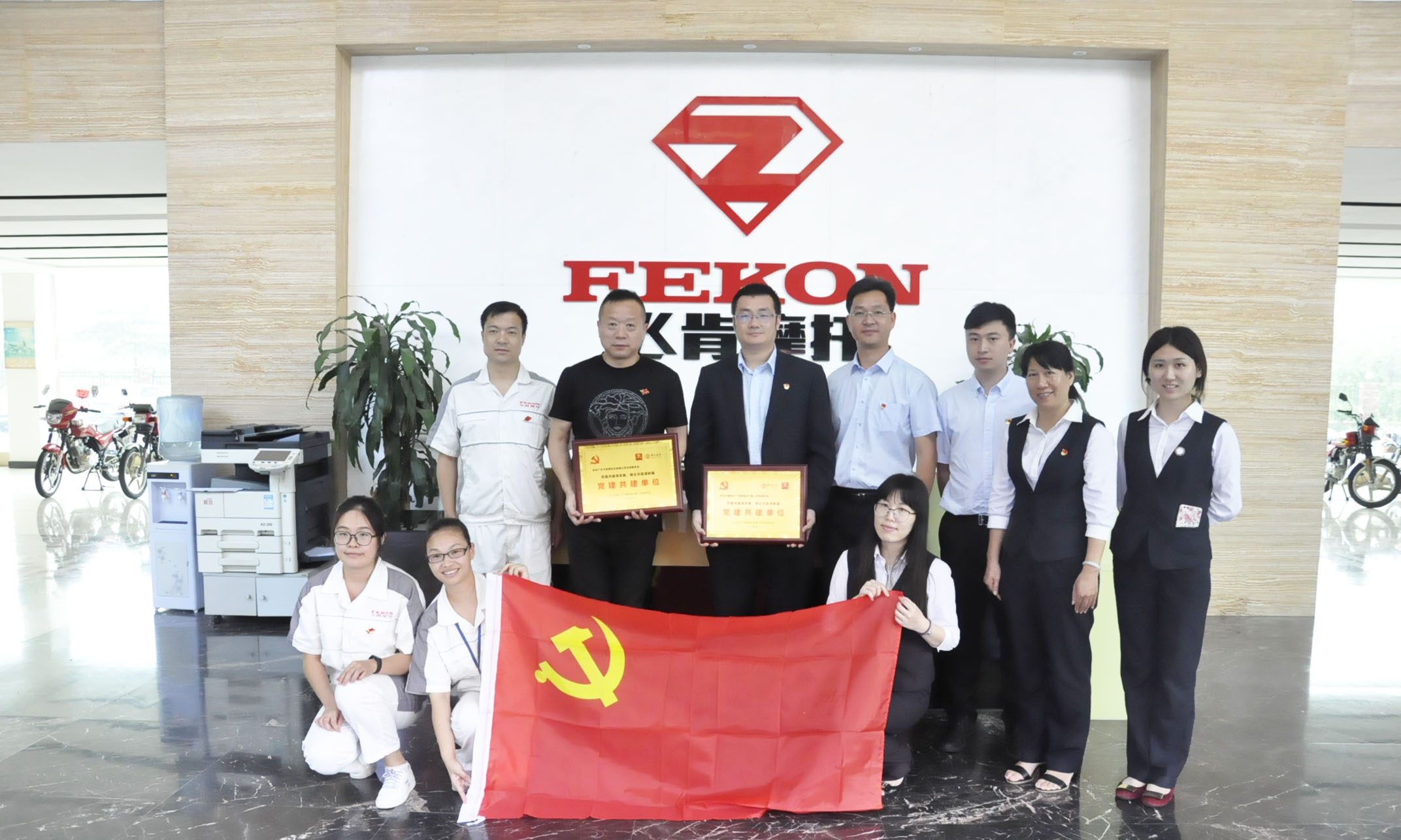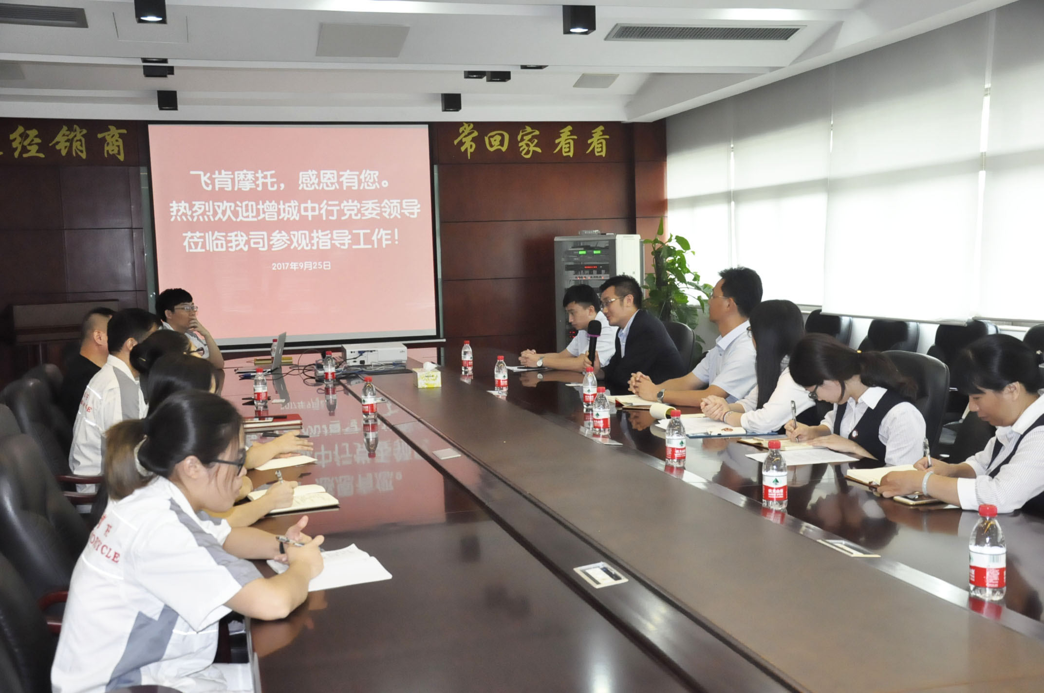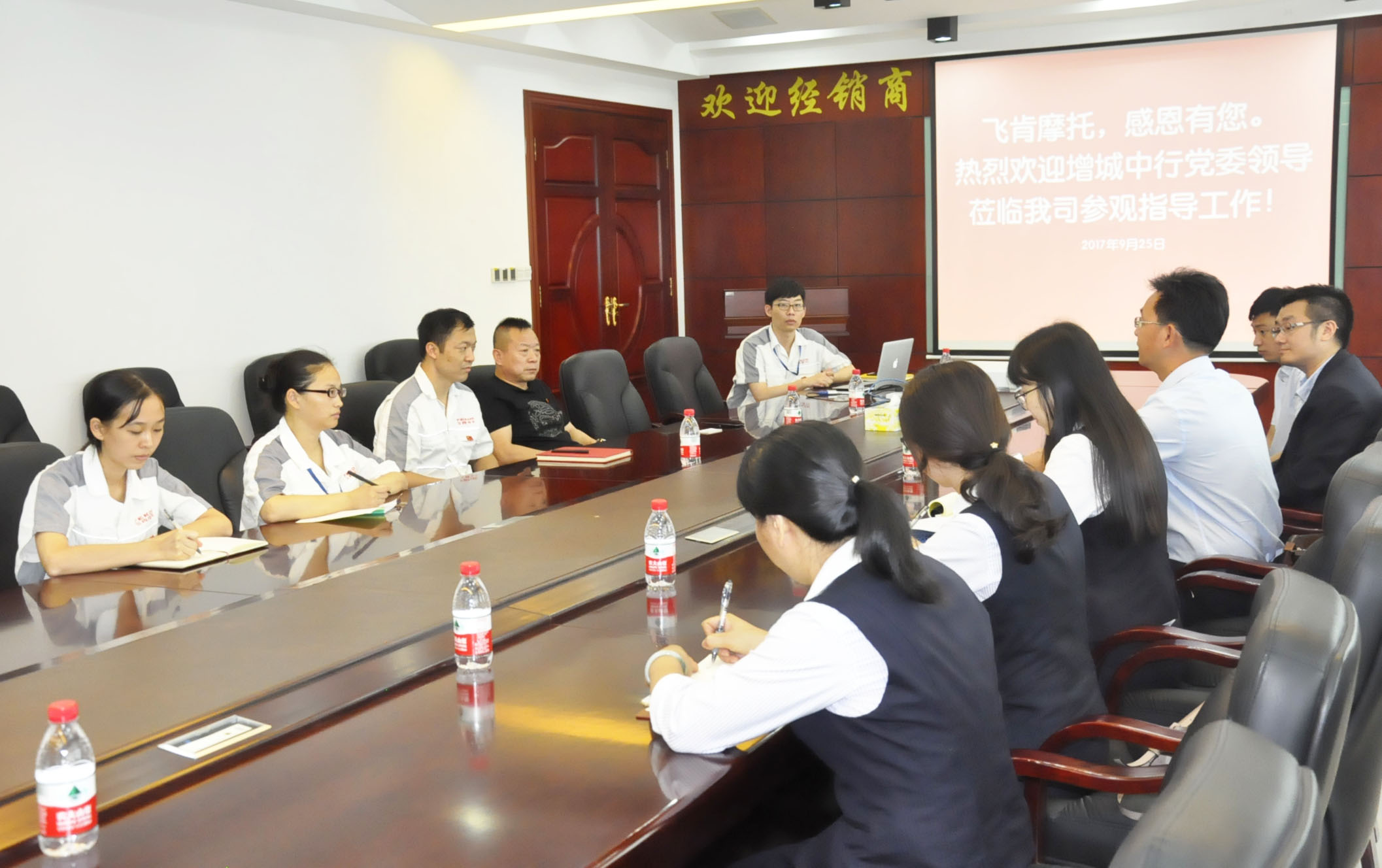 飞肯摩托总经理兼党支部书记郑洪同志、财务部经理兼发改委主任邓赞长同志及其他党员同志,同增城中行党委组织领导,首先在会议室进行了深入交流。