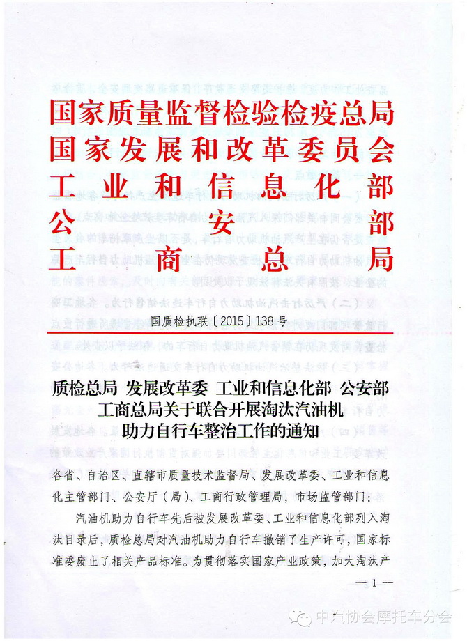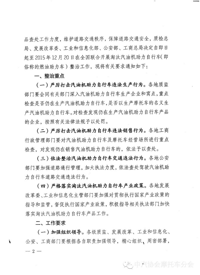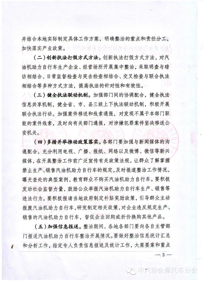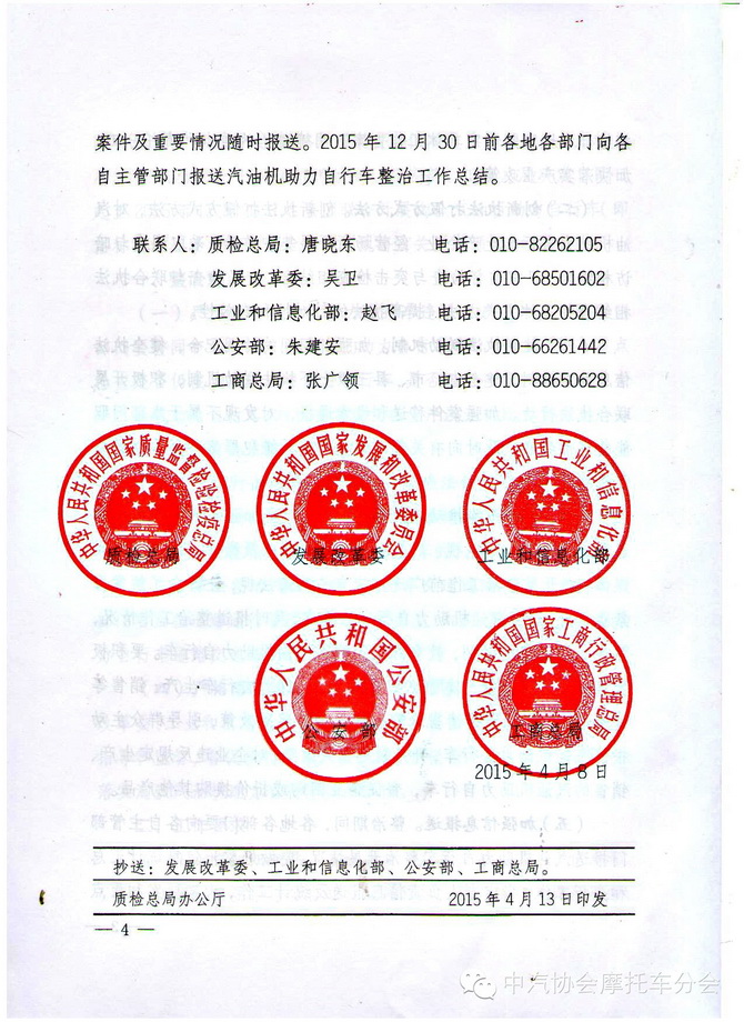 摩托车分会通过多次市场调研,将非法燃油助力车实际情况及时反映给政府相关部门,并进行了多次沟通汇报。4月13日,国家质检总局牵头,联合国家发改委、工信部、公安部、工商总局出台了开展淘汰汽油机助力自行车整治工作的通知。