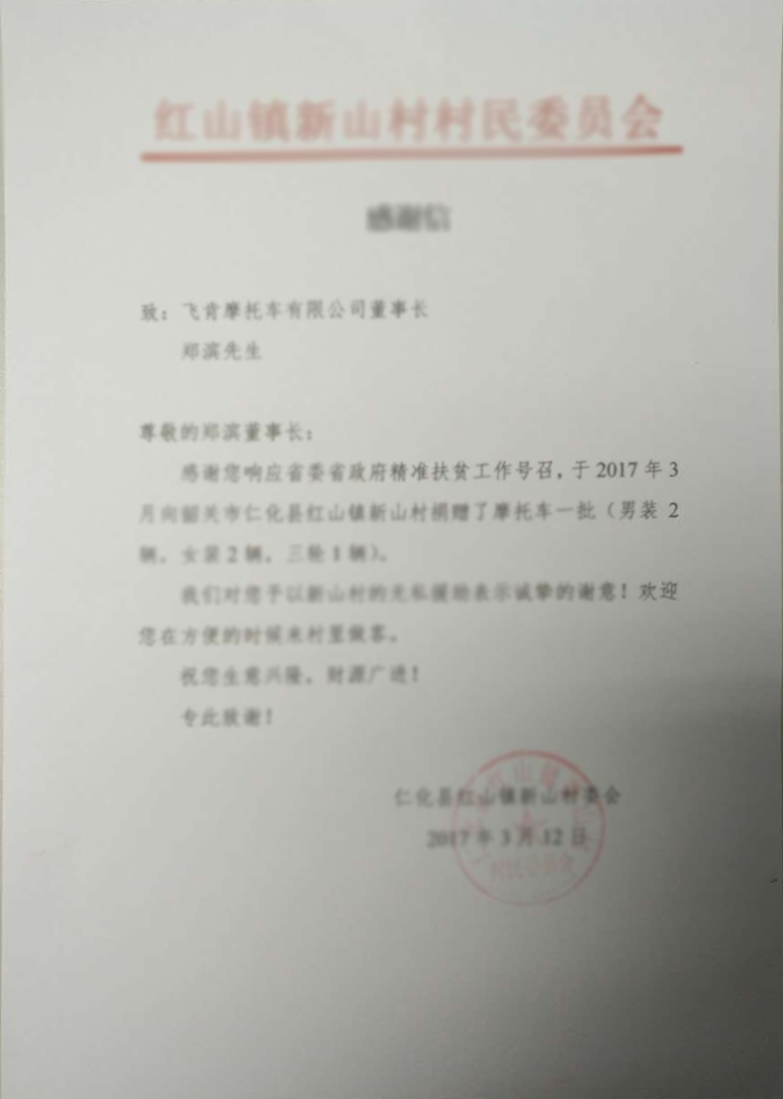 3月13日,有一封这样的信件悄然而至飞肯总部,细看上面的文字,这是一封感谢信,来自红山镇新山村,他们感谢飞肯董事长郑滨先生,感谢他在上周末给村委会送去了一批摩托车(男装车2辆,女装车2辆...